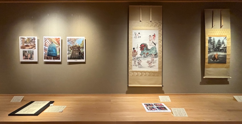 大村神社を描いた穐月作品とパネル展示、右から「神事の日」「太神楽図」「虫喰鐘と禅定寺跡のパネル」