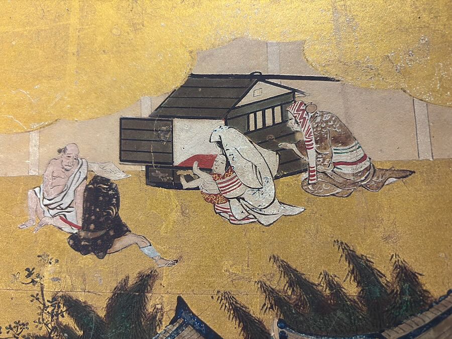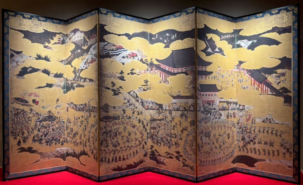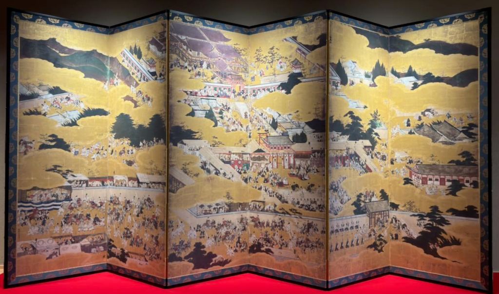 右隻は豊国神社(この後、縮小移転)の前で諸大名から送られた馬に乗った神官の絢爛なパレードが描かれています。織田信長が行った有名な馬揃えより盛大だったと言われます。