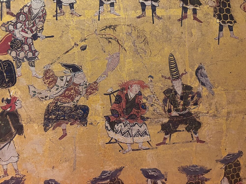 左隻/そうすると鯛釣って踊ってるのは恵美須さんでしょうか。隣りで座ってる偉そうな人は鷹狩りのようですが誰でしょう?
