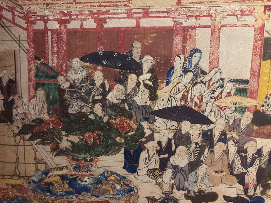 左隻/大仏殿の門の正面で傘を差しかけてもらっている年老いた尼さんが北政所(秀吉の妻)ねねさんだと言う説が有ります。