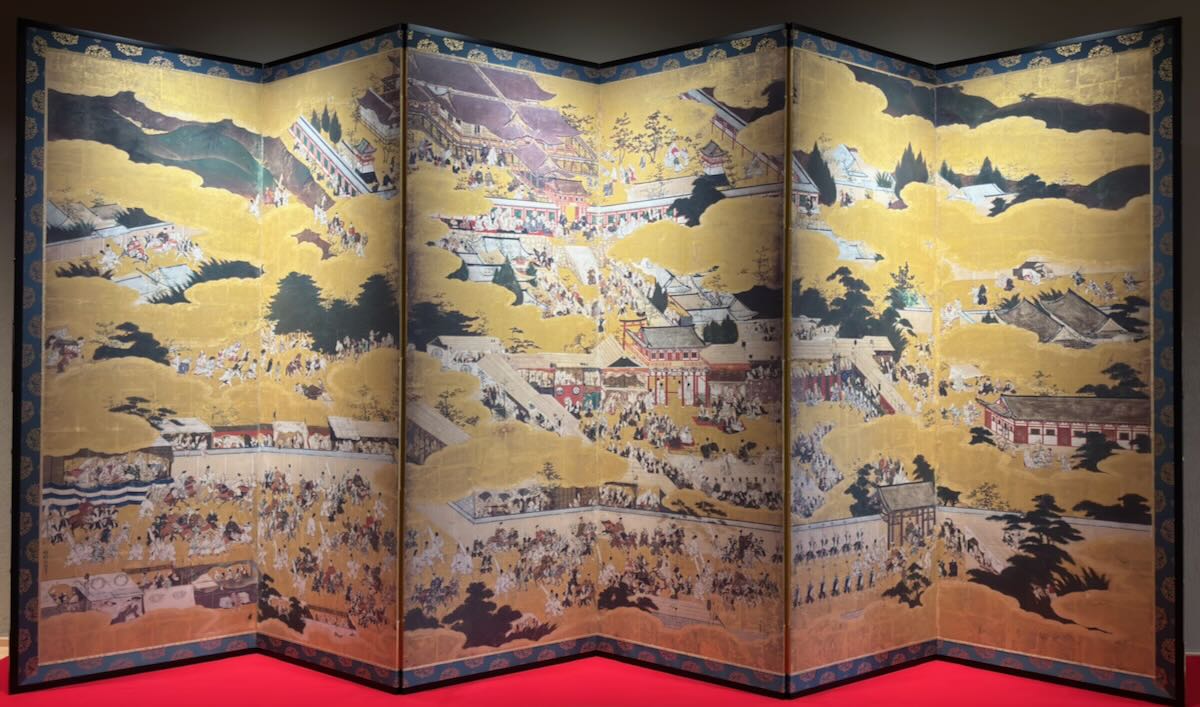 右隻は豊国神社(この後、縮小移転)の前で諸大名から送られた馬に乗った神官の絢爛なパレードが描かれています。織田信長が行った有名な馬揃えより盛大だったと言われます。
